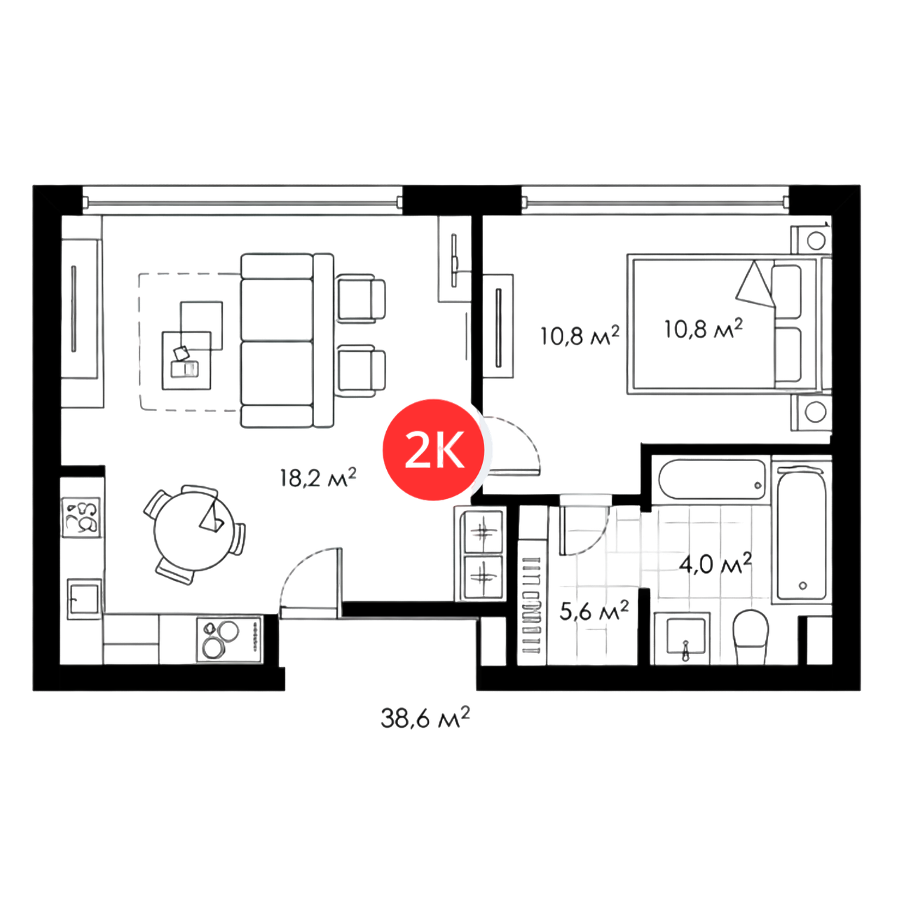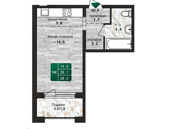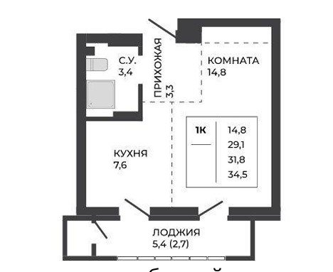 Квартира со свободной планировкой. На этом пространстве можно обустроить полноценную 1-комнатную квартиру с отдельной кухней. Под кухню застройщик предлагает отвести 7,6 «квадрата». Еще 3,3 м² остается на прихожую и 14,8 м² — под общую комнату