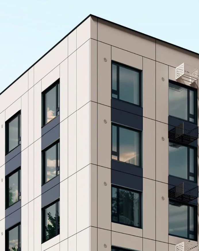 Стильная архитектура фасадов выполнена в сером, белом и коричневом цветах. Тип домов - панельный с вентилируемыми фасадами и фактурой натурального камня, что придает особый элегантный вид.